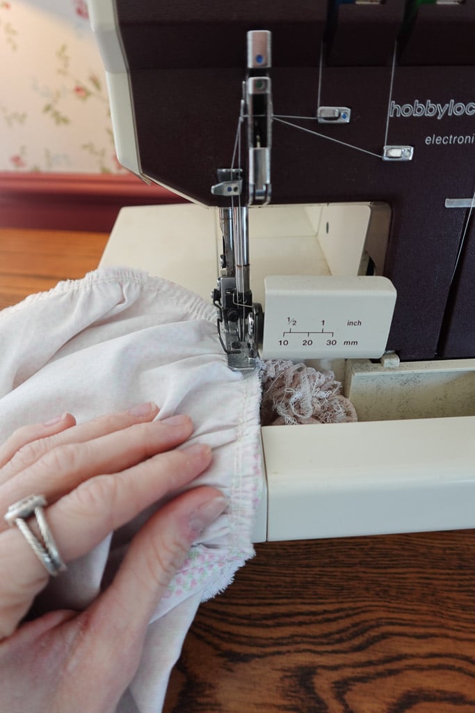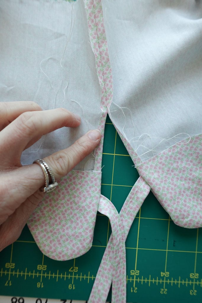 During this step you will edge stitch about 1/4-inch from the sides around the scalloped portion of the lining. This will add a nice finish to both your scallops and the seam where your ties are. It will also enclose the raw edges of the overhang area, so be sure those are pressed inward as you sew.
