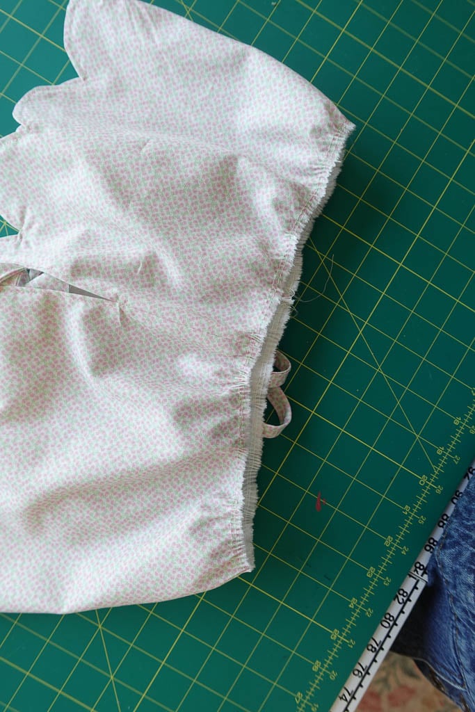 Tug on the bobbin threads of both sets of stitches to gently gather the fabric at the base. You will not need to gather this too much. You want the fabric to line up perfectly with the circular piece of fabric you cut at the beginning.